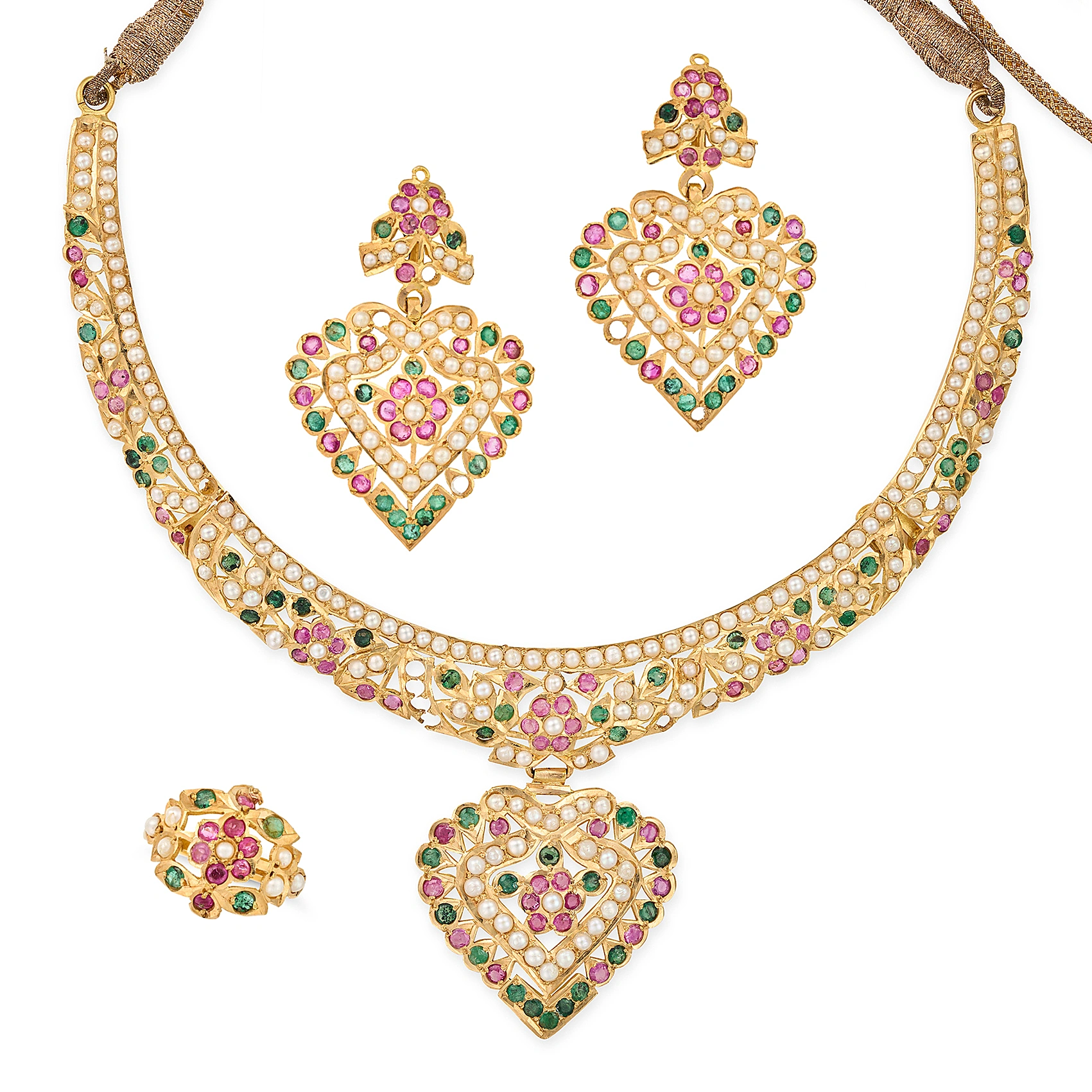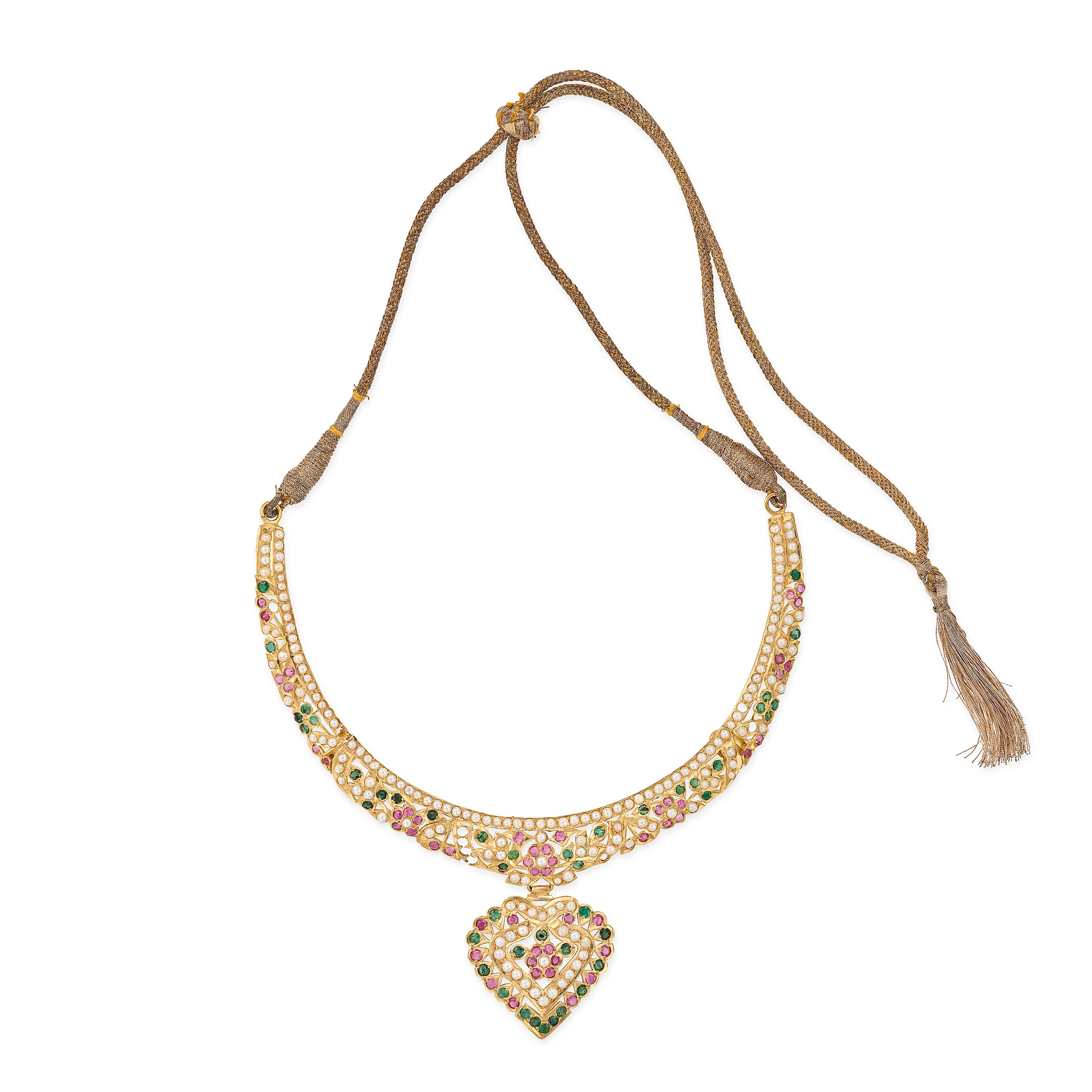 AN INDIAN PEARL, RUBY AND EMERALD HEART NECKLACE, ...