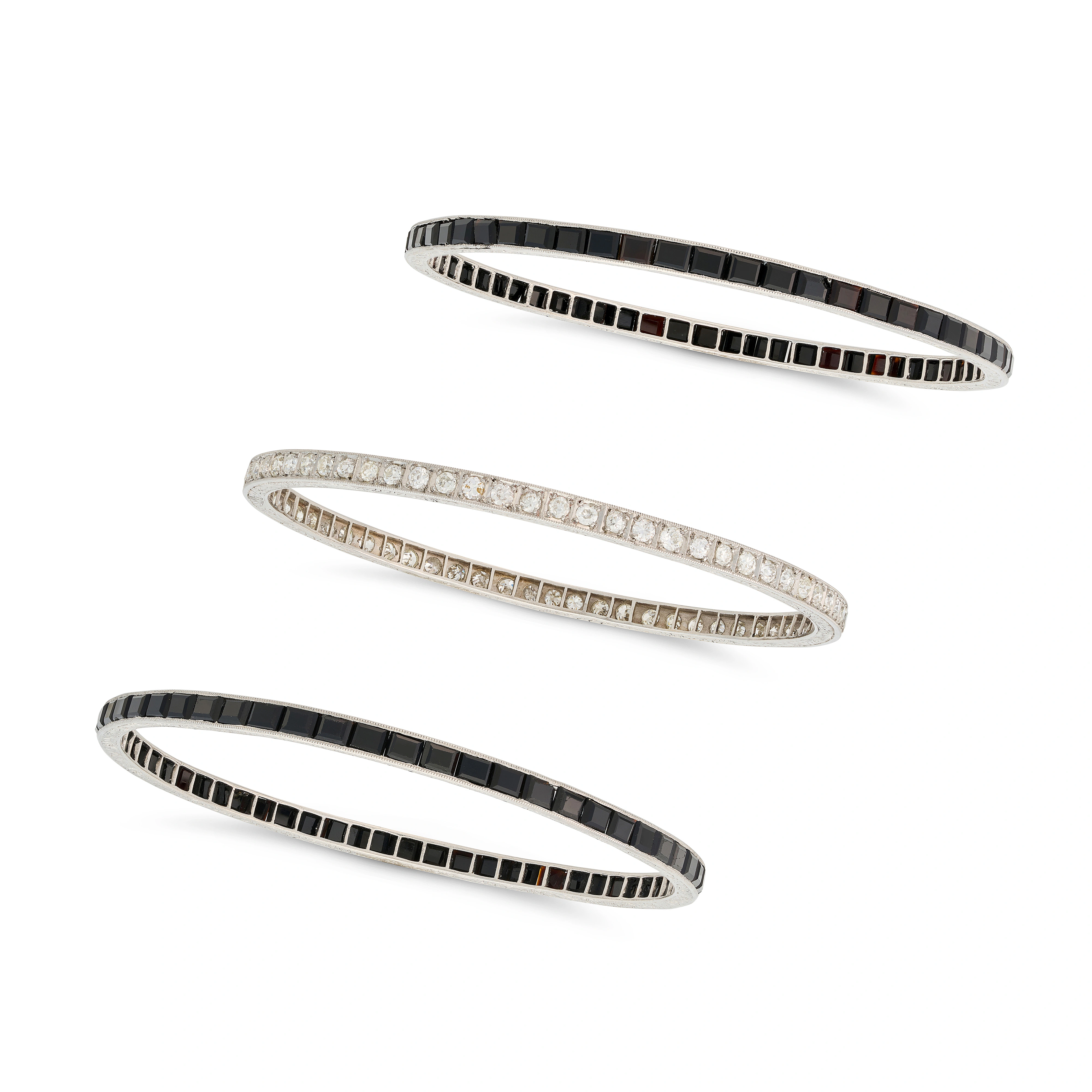 THREE ART DECO ONYX AND DIAMOND BANGLES, EARLY 20T ...
