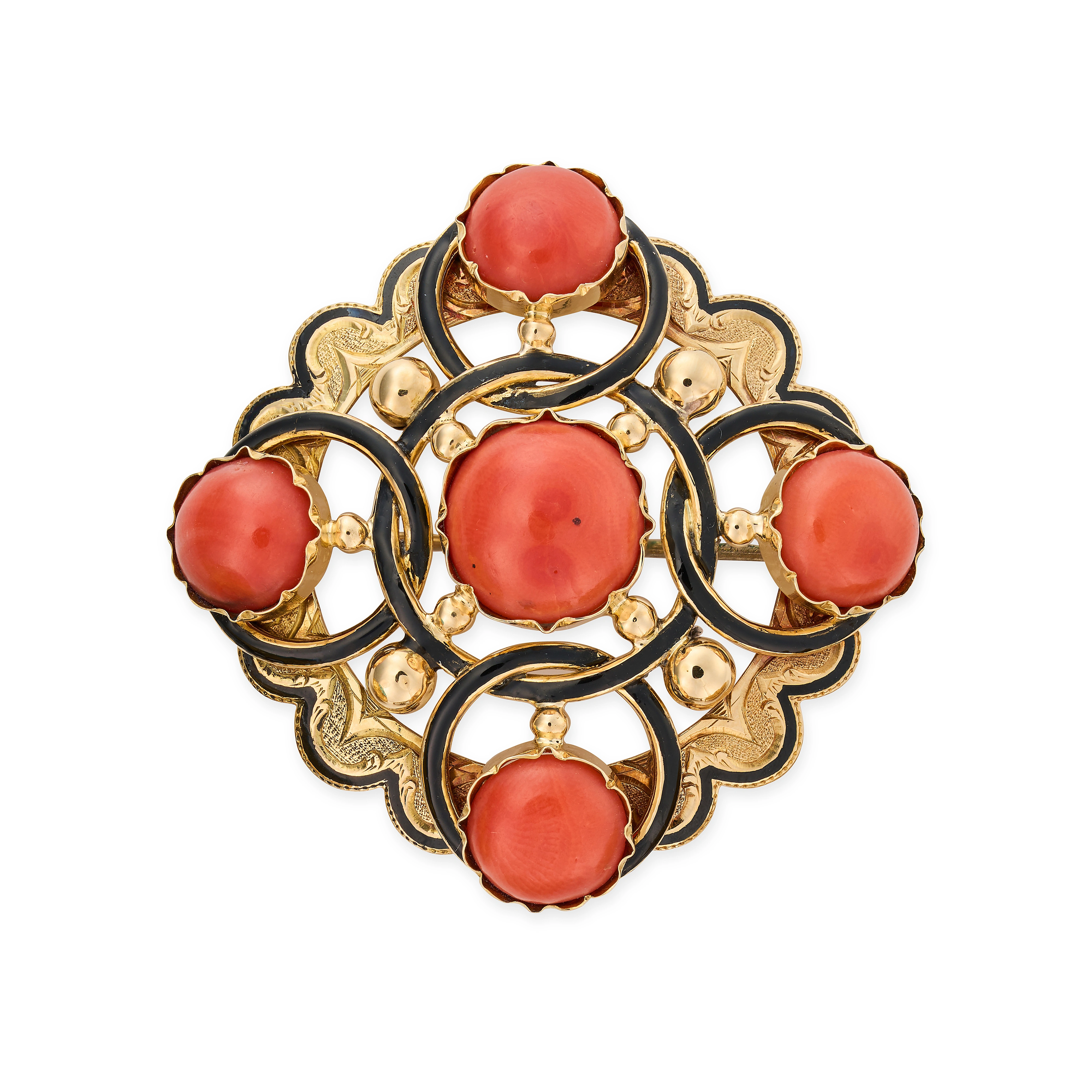 AN ANTIQUE VICTORIAN CORAL AND ENAMEL BROOCH in ye ...