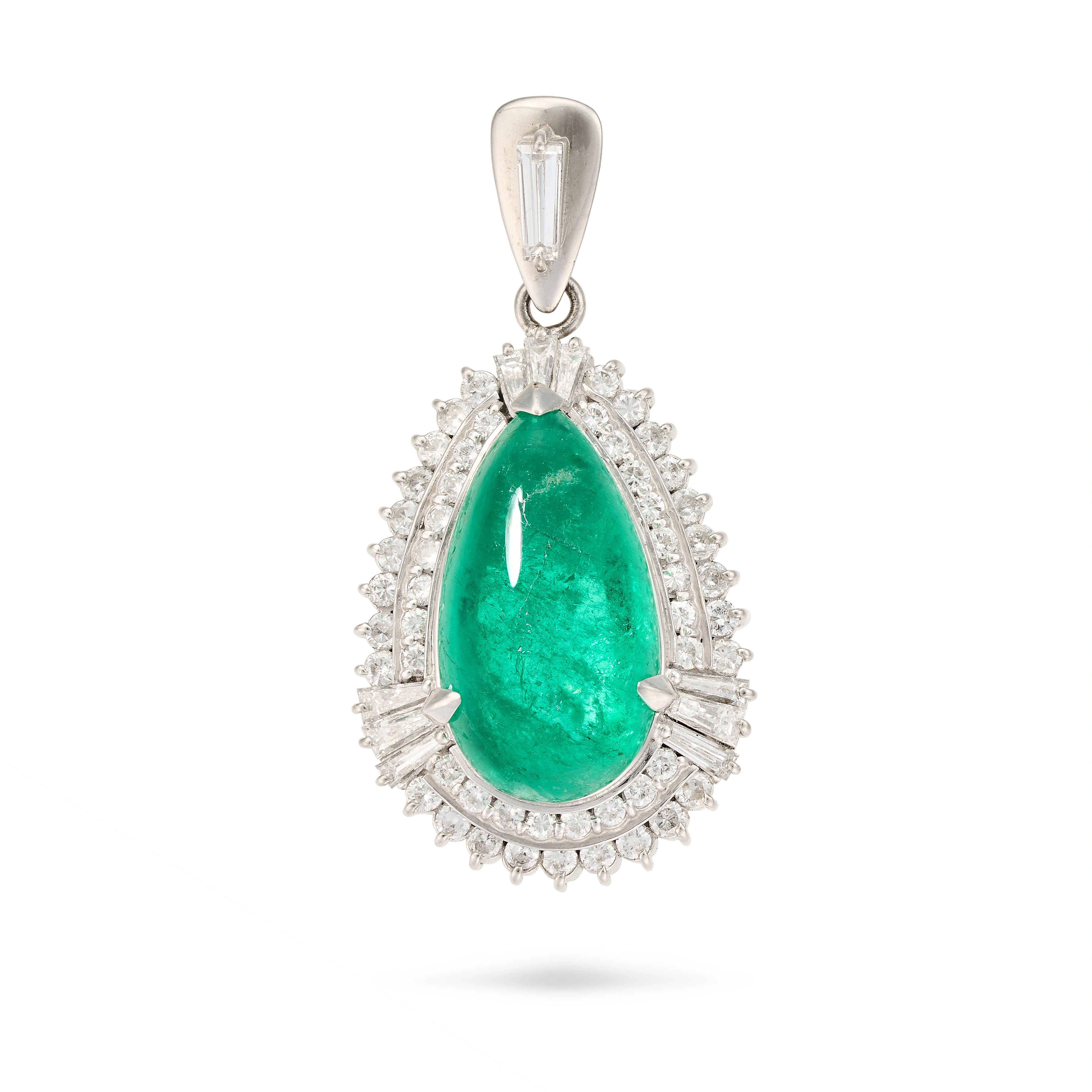AN EMERALD AND DIAMOND PENDANT set with a pear sha ...