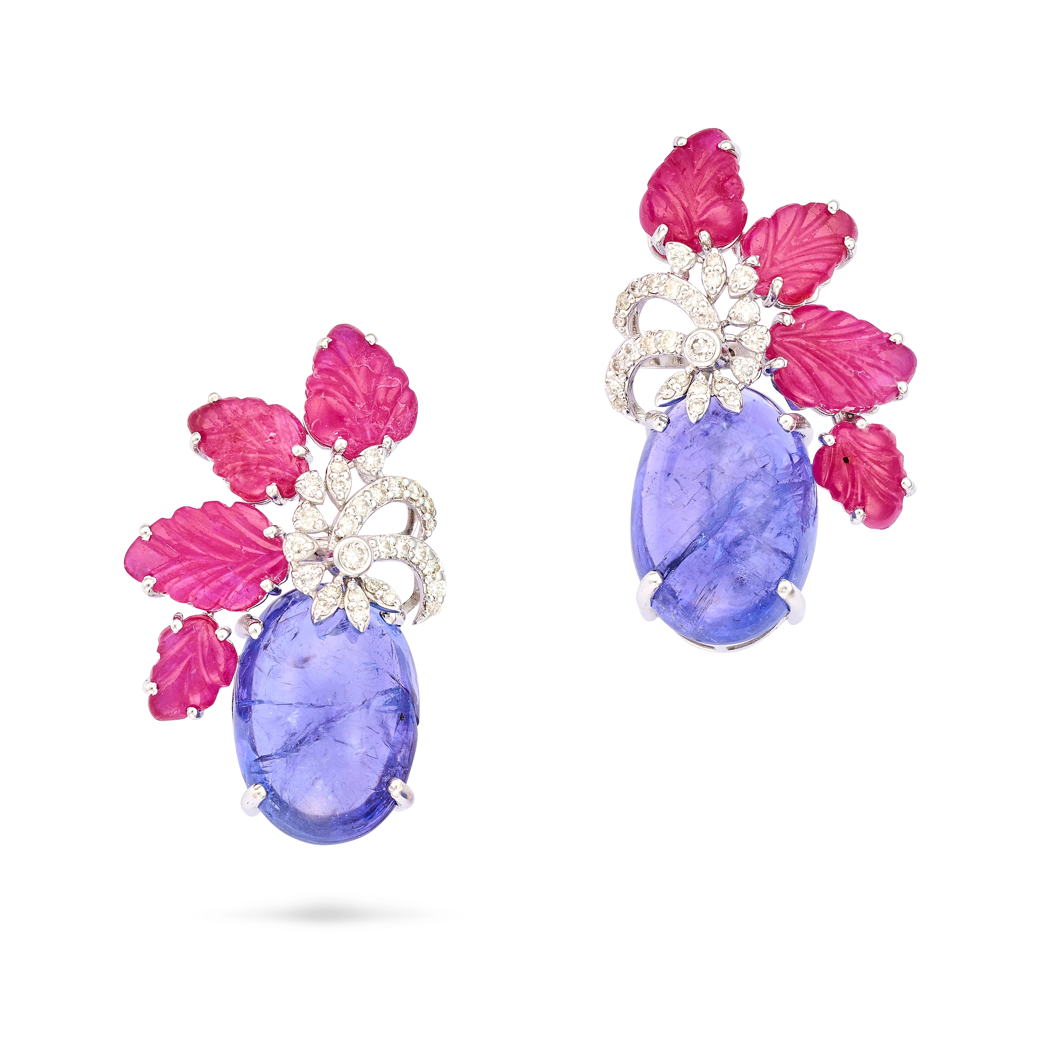A PAIR OF TANZANITE, RUBY AND DIAMOND EARRINGS eac ...