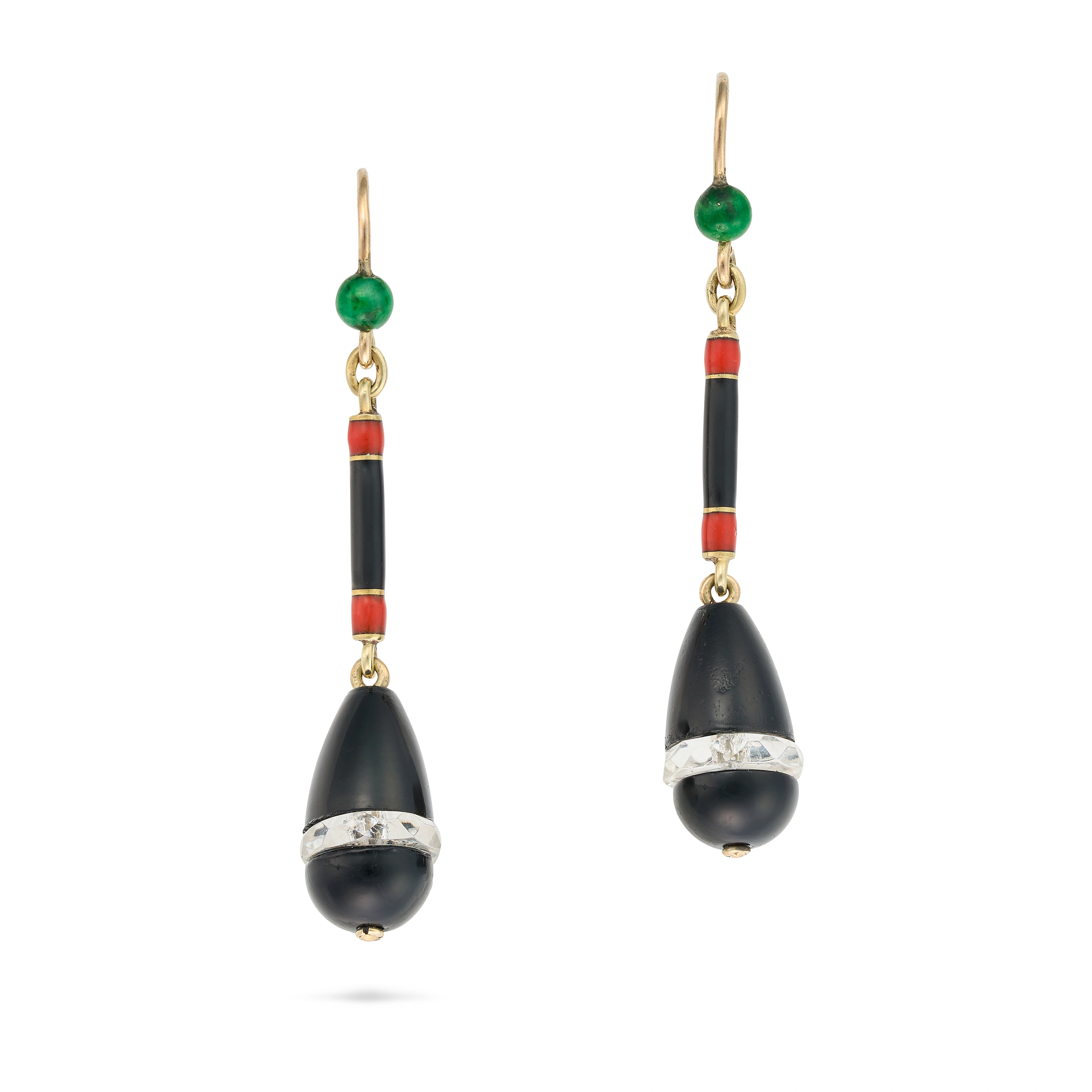 A PAIR OF ONYX, ROCK CRYSTAL AND JADEITE JADE DROP ...