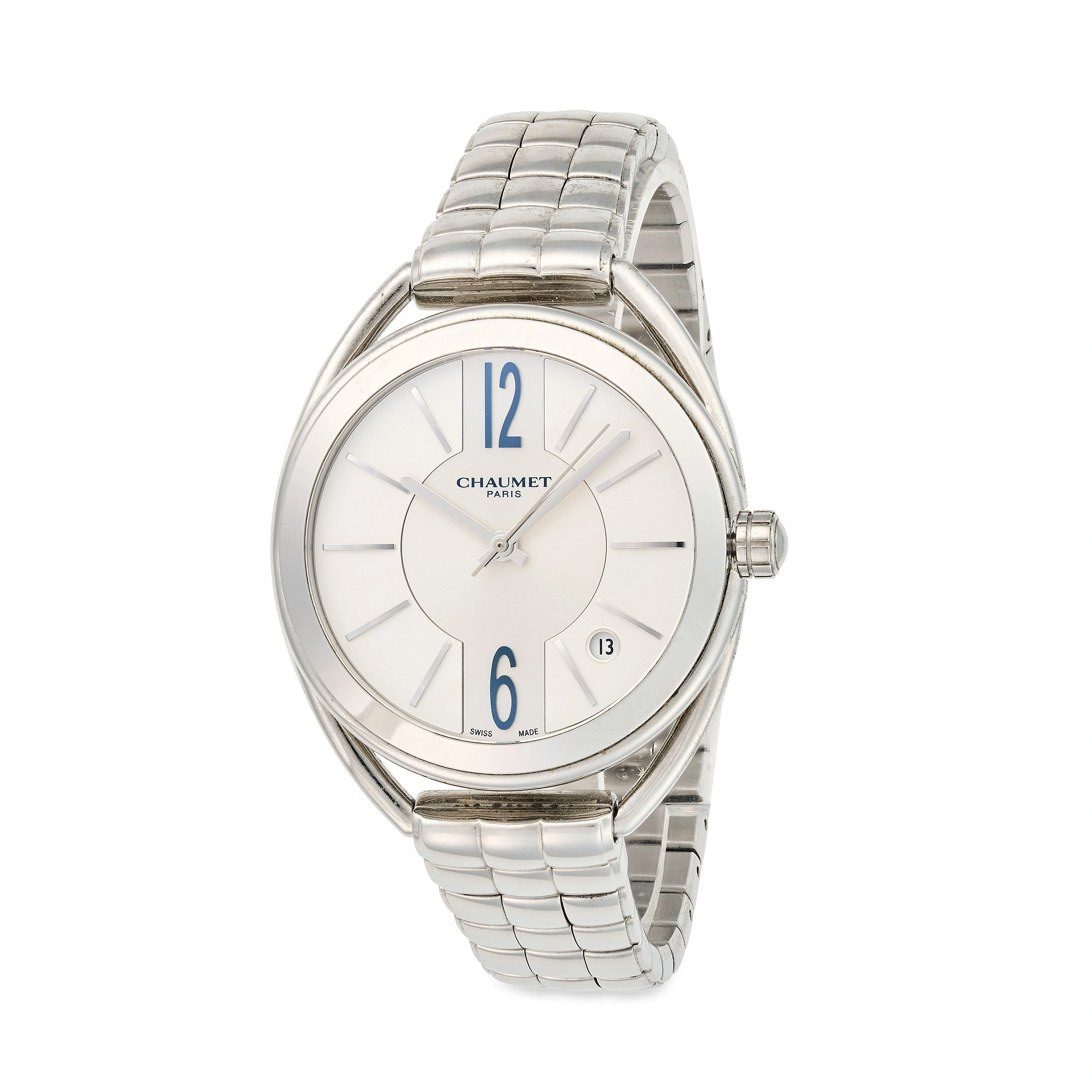 CHAUMET, A LIENS DE CHAUMET AUTOMATIC WRISTWATCH, in stainless steel, the rounded polished case with stylised curved lugs, surrounding a silvered dial with applied baton hour markers, Arabic numerals at 12 and 6, central sweep seconds and date aperture between 4 and 5 o’clock, signed Chaumet Paris, to an articulated stainless steel bracelet with concealed clasp, caseback with exhibition sapphire display showing the automatic movement signed LIENS de CHAUMET, the caseback further engraved Chaumet Paris, Automatique, Swiss made, dial and case signed Chaumet, automatic movement, case approximately 32mm. Accompanied by Chaumet presentation box, instruction booklet and international guarantee booklet.