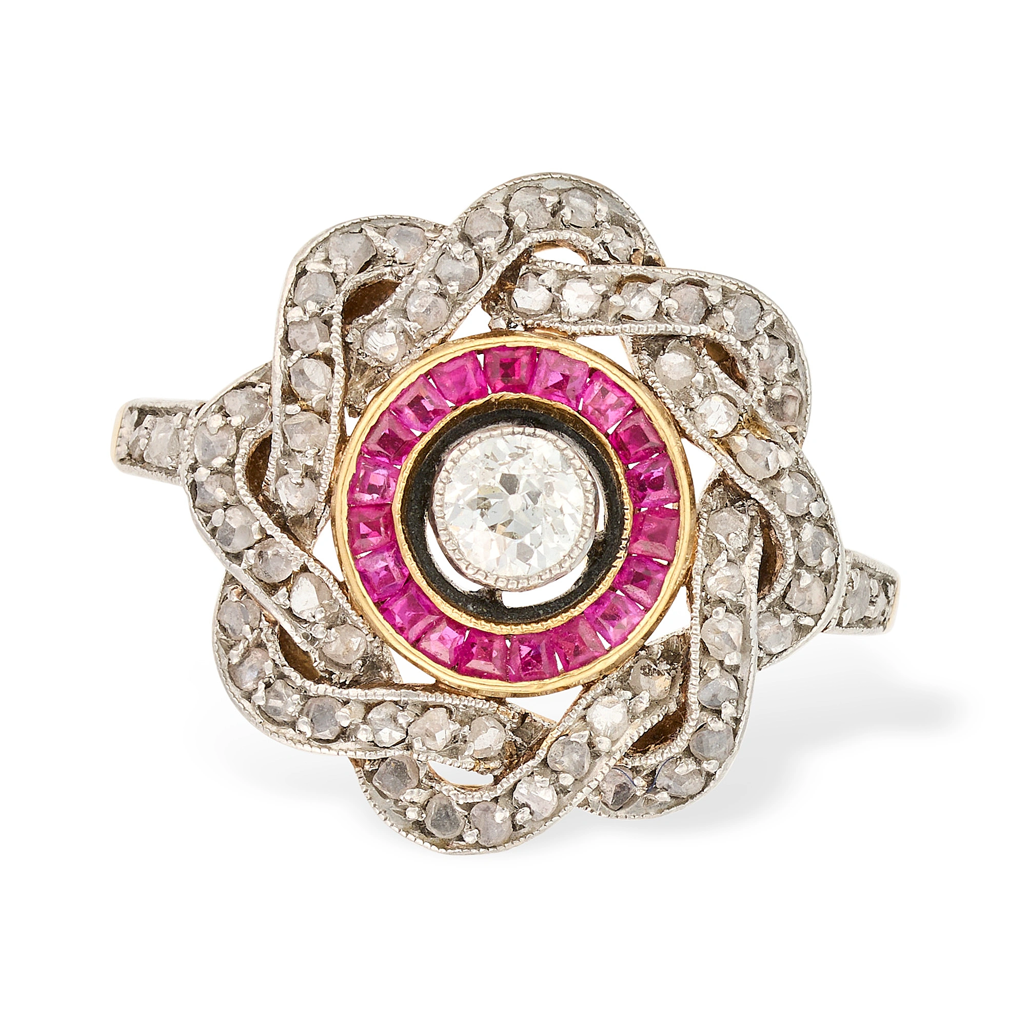 AN ANTIQUE DIAMOND AND RUBY DRESS RING, EARLY 20TH CENTURY set with an old cut diamond within a frame of calibre cut rubies, accented by a scrolling border set with rose cut diamonds, marked indistinctly, size M / 6.25, 4.6g.