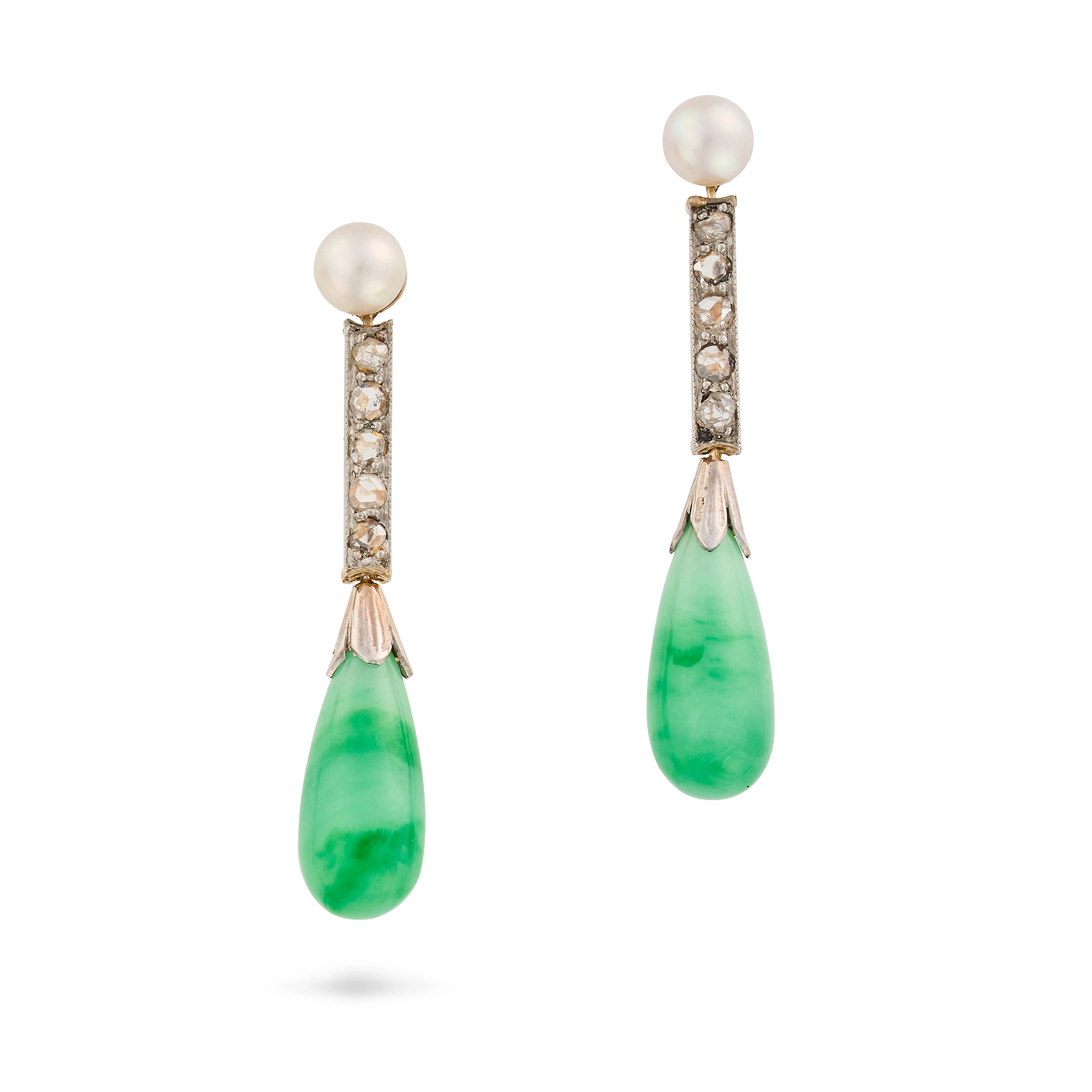 A PAIR OF JADEITE JADE, DIAMOND AND PEARL DROP EAR ...