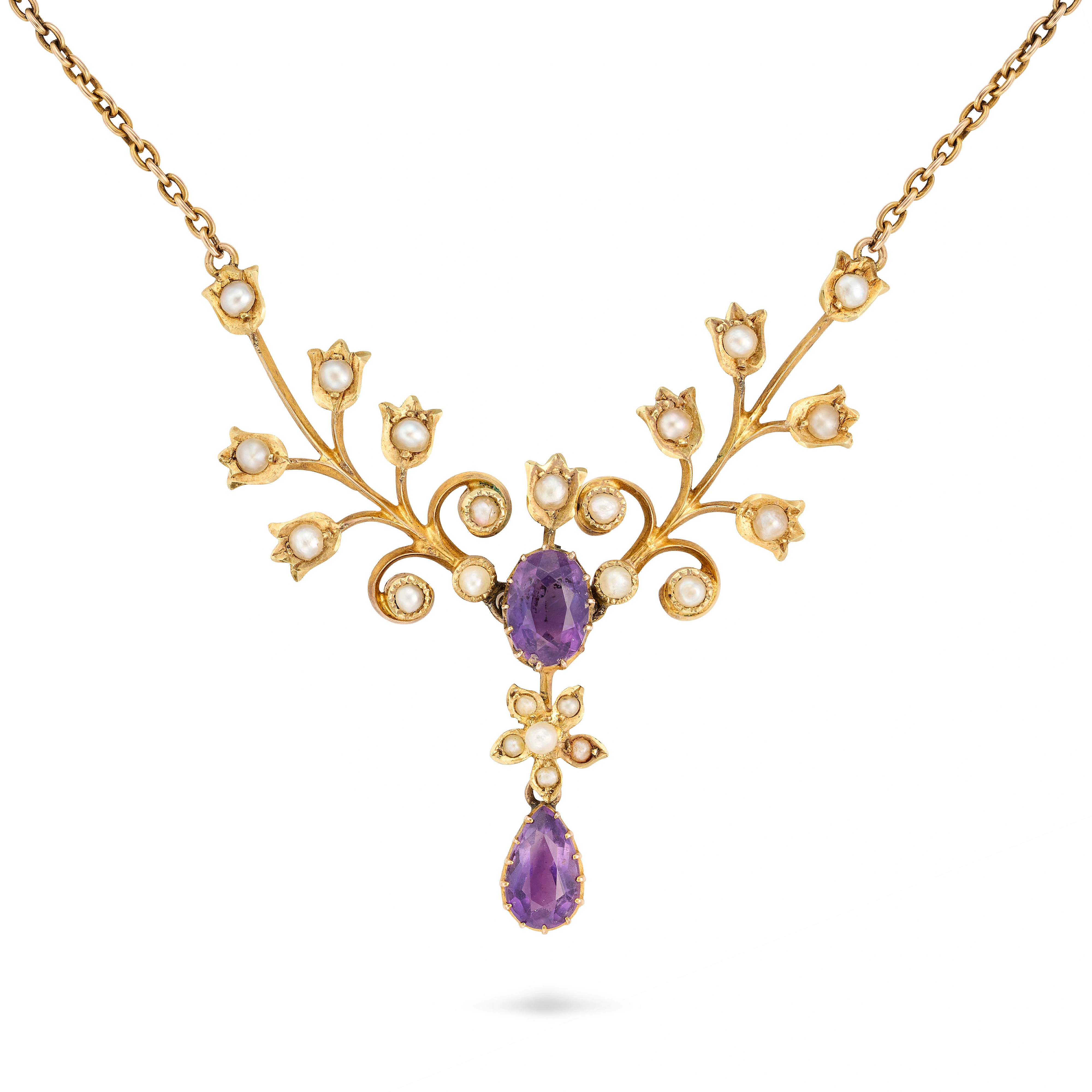 AN ANTIQUE AMETHYST AND PEARL NECKLACE in yellow g ...