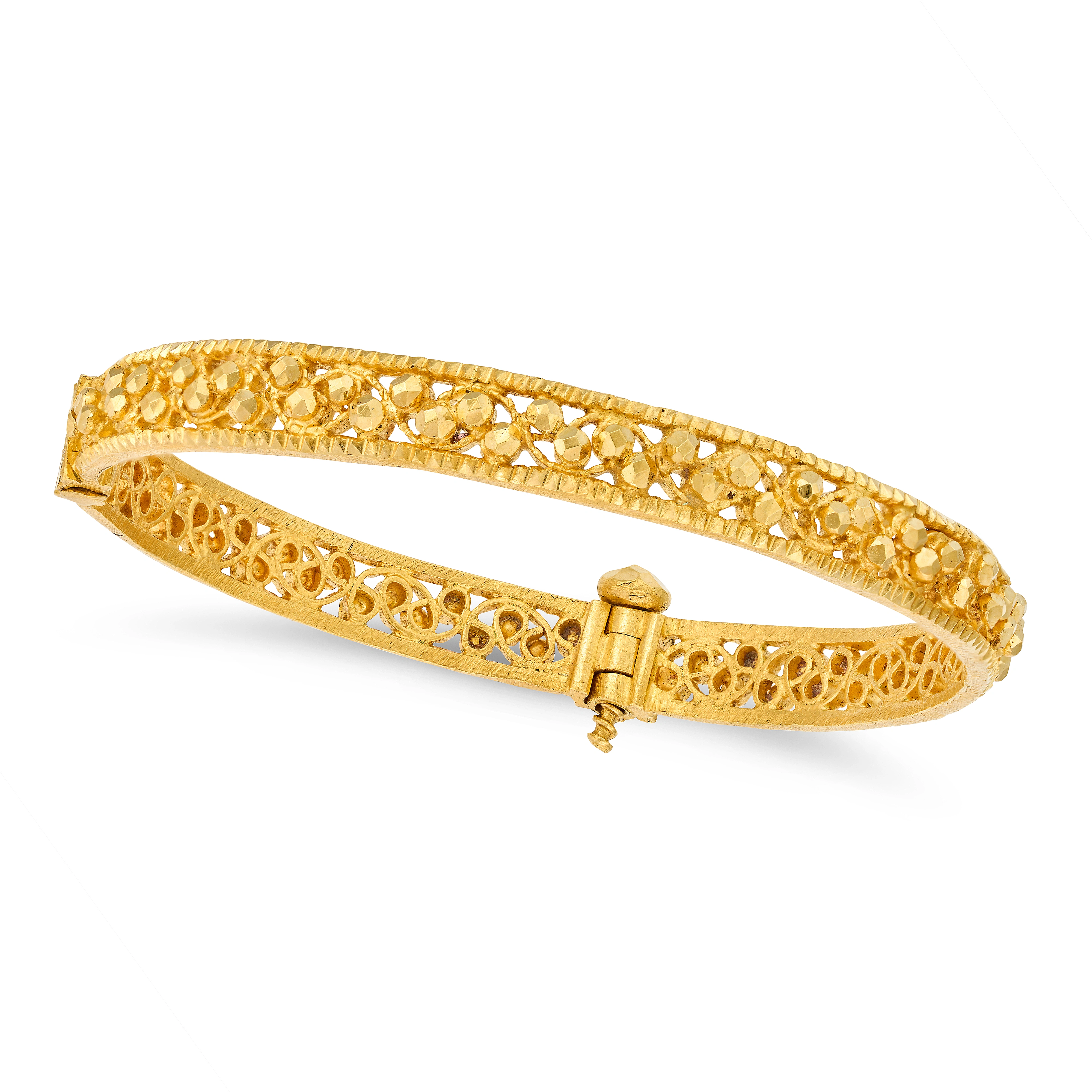 A GOLD BANGLE in high carat yellow gold, the hinge ...