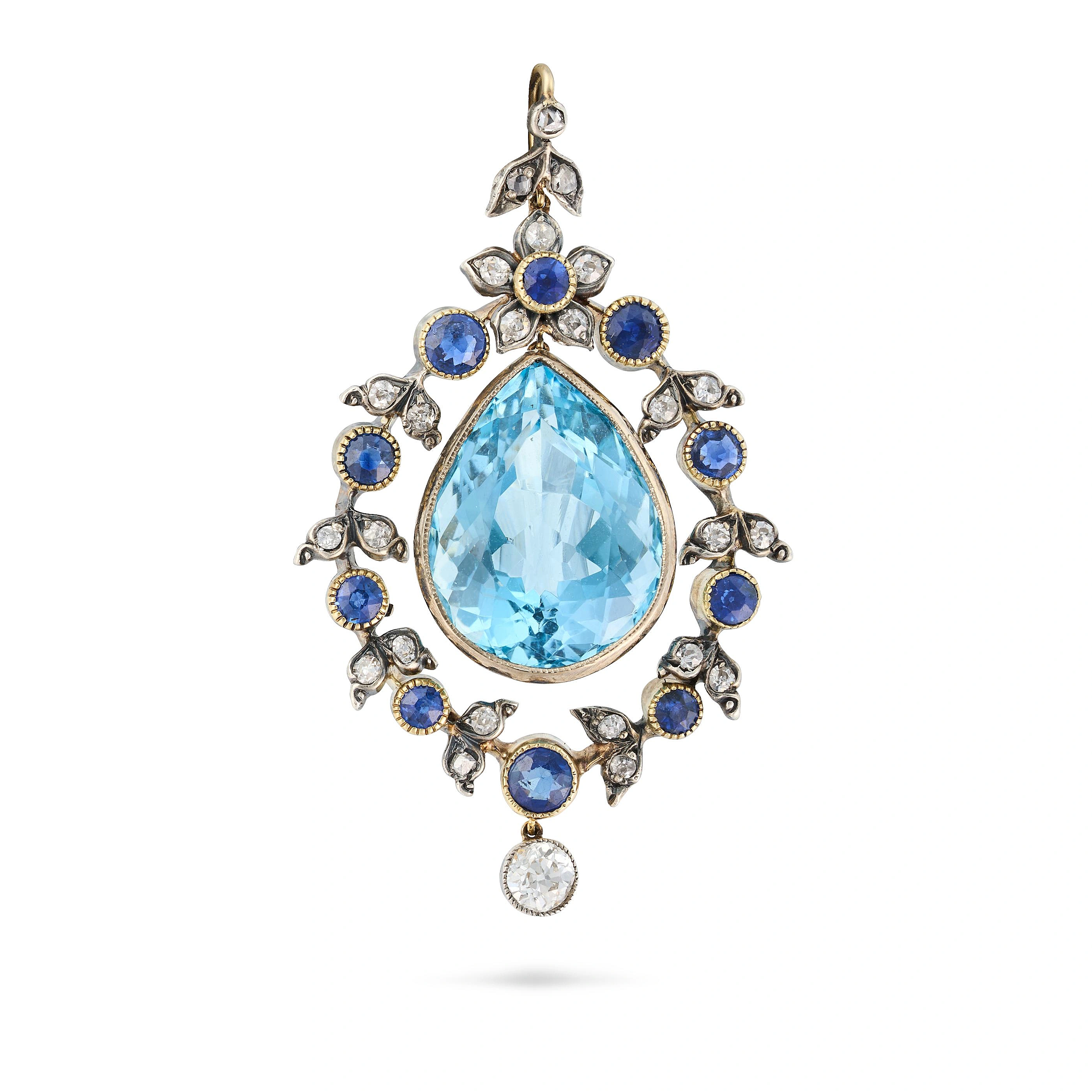 AN ANTIQUE AQUAMARINE, SAPPHIRE AND DIAMOND PENDAN ...