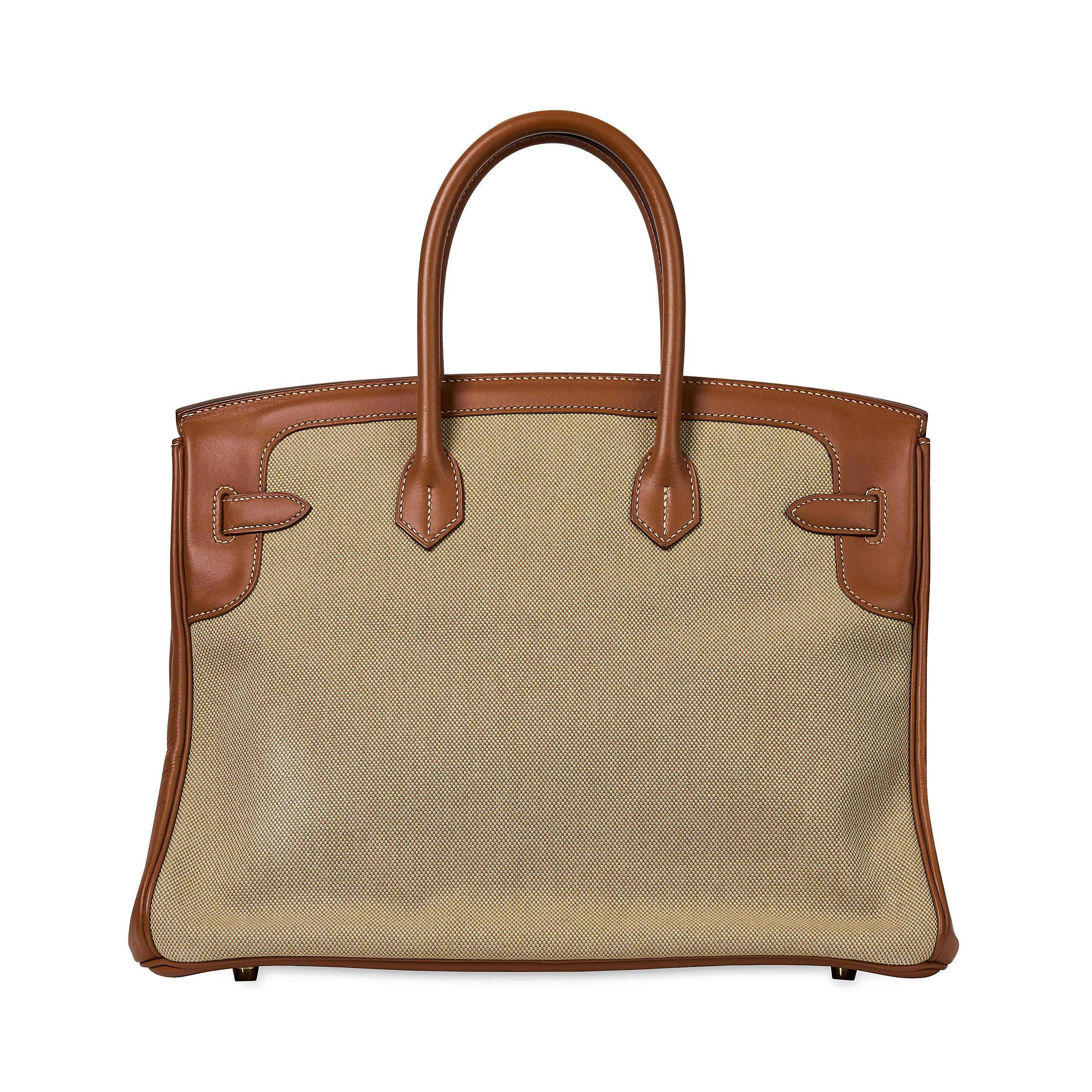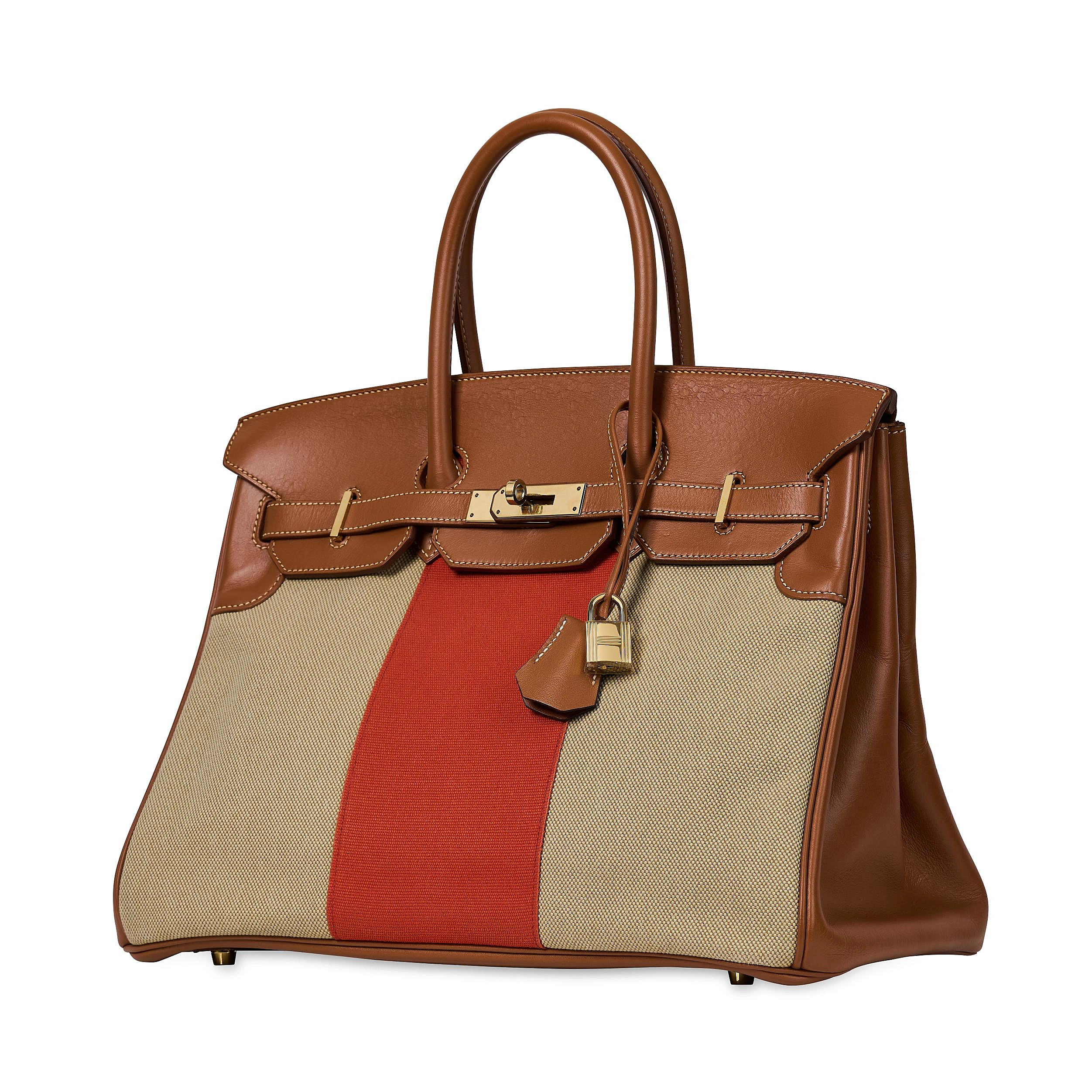 Fauve Barenia leather and Paprika and Ficelle Toile canvas exterior with contrast white stitching, double straps with turnlock closure, four metal feet at base and double leather top handles. Tonal leather and canvas interior with an inner slip pocket and an inner zip pocket. Permabrass hardware. 35cm long, 27.5cm high, 11cm handle drop. Stamped [R]. Production period 2014. Accompanied by dust bag, clochette, padlock and set of keys.