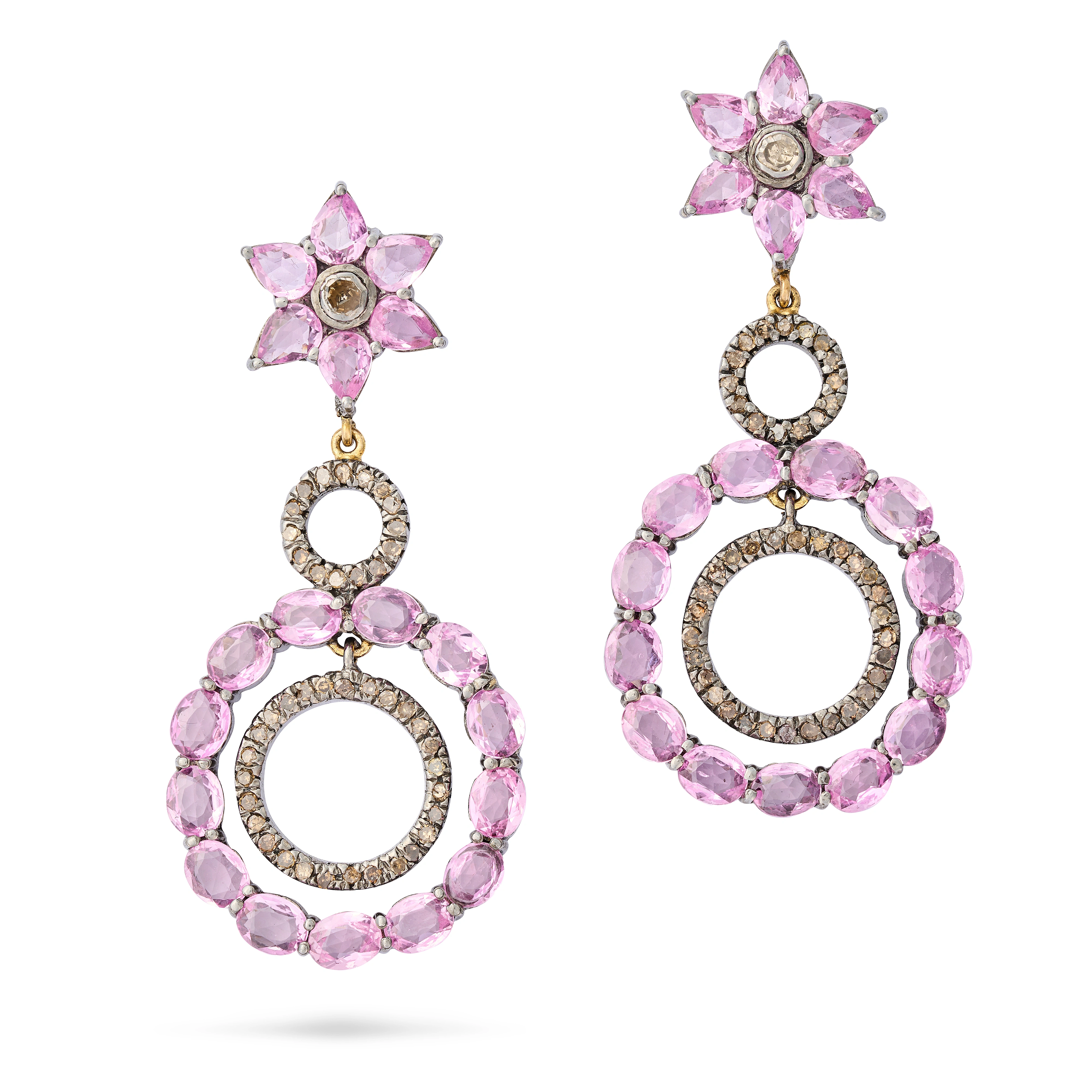 A PAIR OF PINK SAPPHIRE AND DIAMOND DROP EARRINGS each comprising concentric hoops of oval cut pink sapphires and round cut diamonds, suspended from a floral cluster set with a round cut diamond and pear cut sapphires, the sapphires totalling 8.5-9.5 carats, the diamonds totalling 0.9-1.1 carats, butterflies stamped 925, 5.0cm, 13.8g.