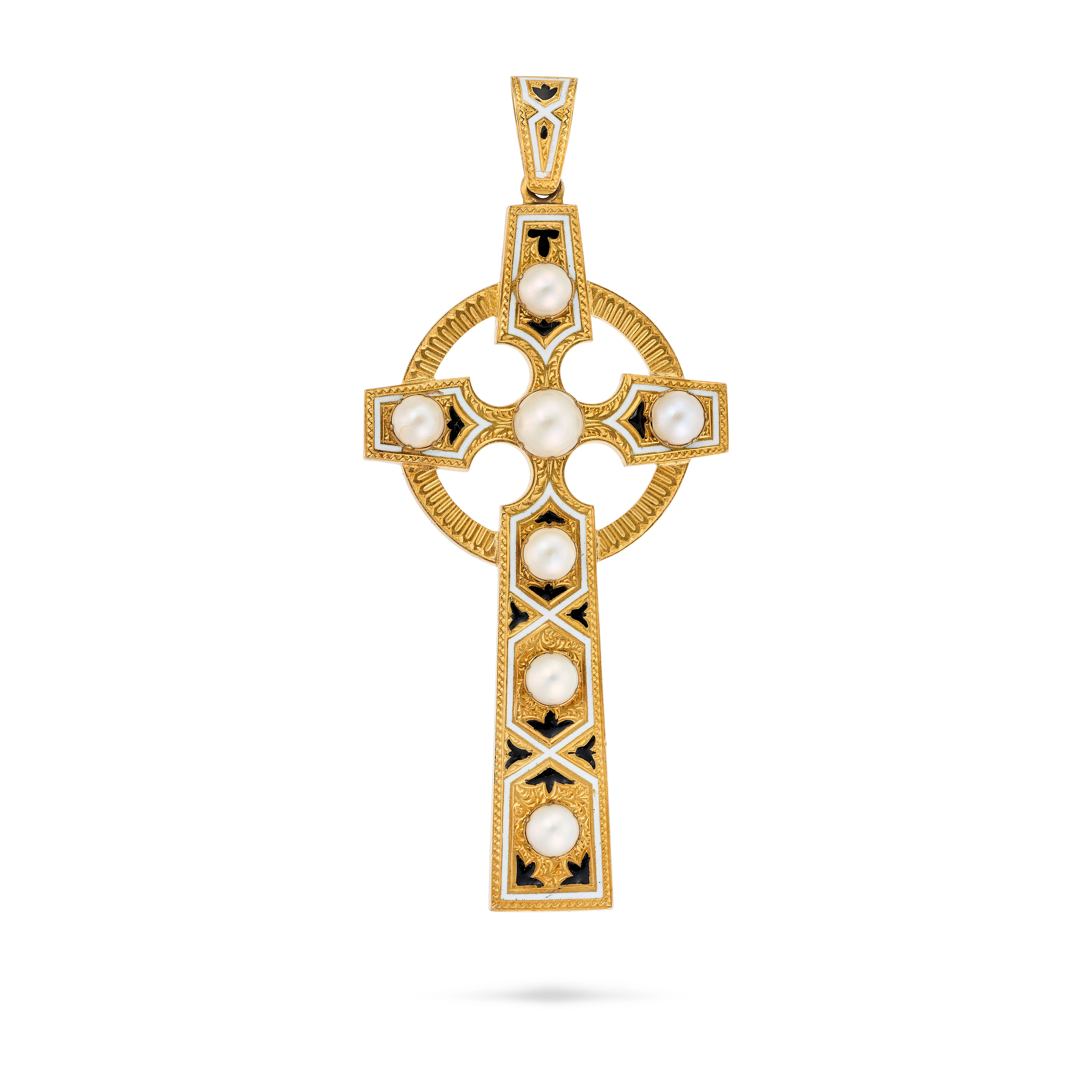 AN ANTIQUE VICTORIAN PEARL AND ENAMEL CELTIC CROSS ...