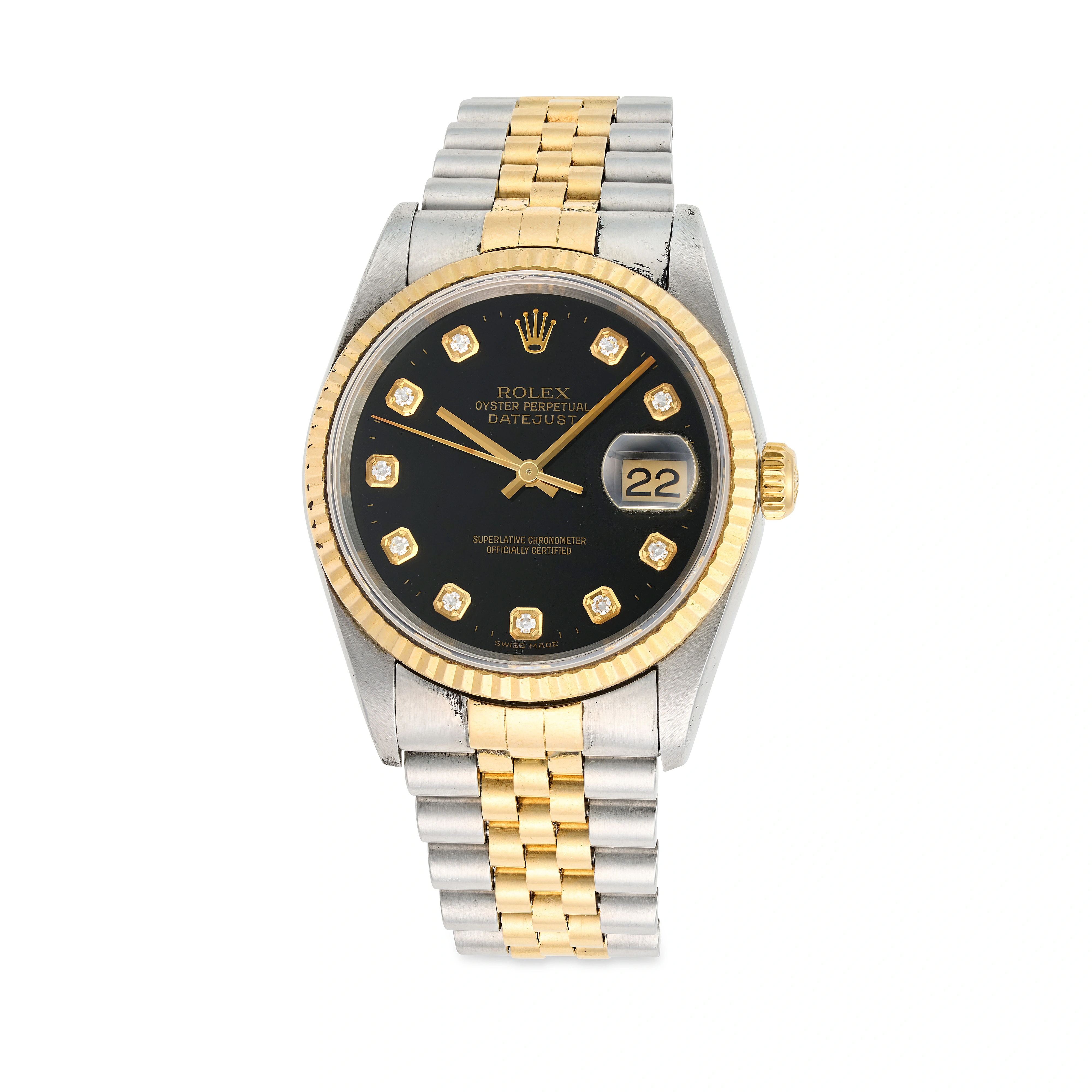 ROLEX, AN OYSTER PERPETUAL DATEJUST WRISTWATCH, ref. 16233, Y serial, circa 2001, in stainless steel and yellow gold, the circular case with fluted yellow gold bezel surrounding a black sunburst dial with diamond-set hour markers, applied gilt baton hands, date aperture at 3 o’clock with cyclops magnification, fitted to a bi-metal stainless steel and yellow gold Jubilee bracelet with folding clasp, bracelet numbered 455 B, dial, case and clasp signed Rolex, automatic movement, case 36mm. Accompanied by a period Rolex box.