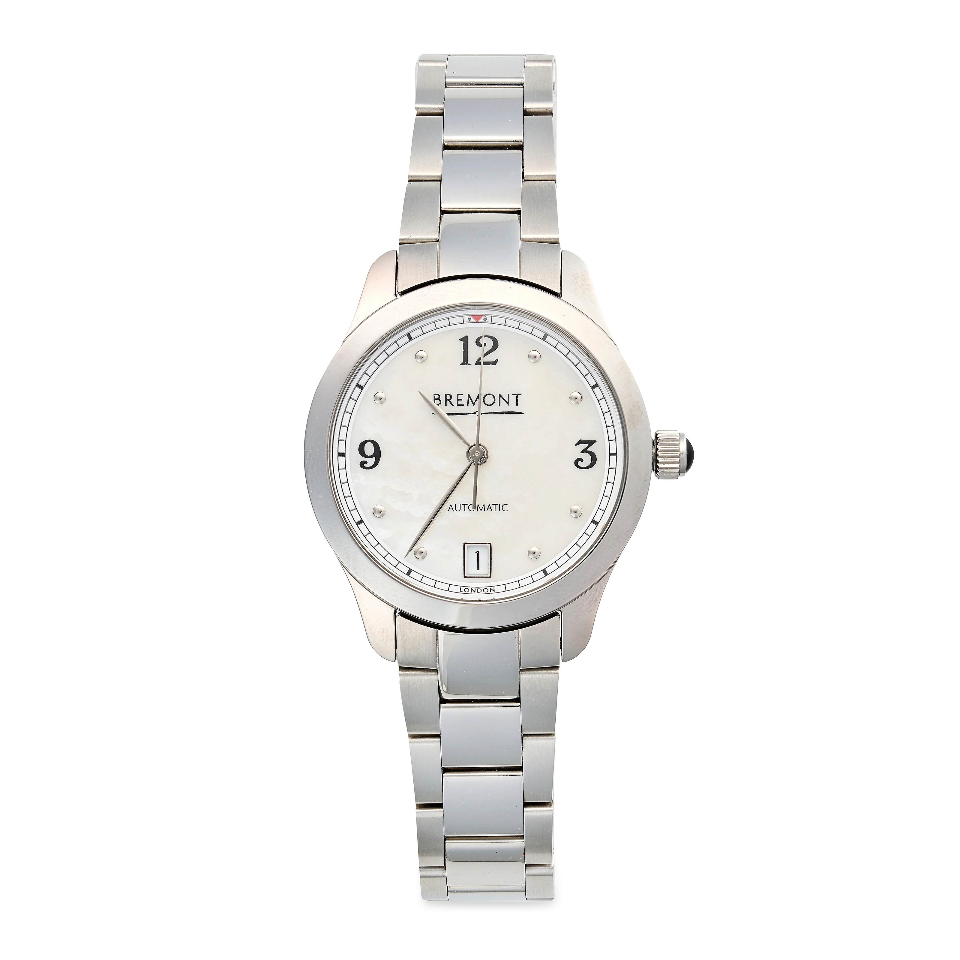 BREMONT, A SOLO-34 AUTOMATIC WRISTWATCH, in stainless steel, a polished round case surrounding a mother of pearl dial with Arabic quarters at 12, 3 and 9, applied diamond-set hour markers, date aperture at 6 o’clock, the display back revealing a chronometer-rated automatic movement signed Bremont, fitted to a stainless steel bracelet with signed clasp, dial, case and movement signed BREMONT, automatic movement, case 34mm. Accompanied by Bremont outer box, red leather travel case, warranty registration card, technical booklet, and international warranty booklet.