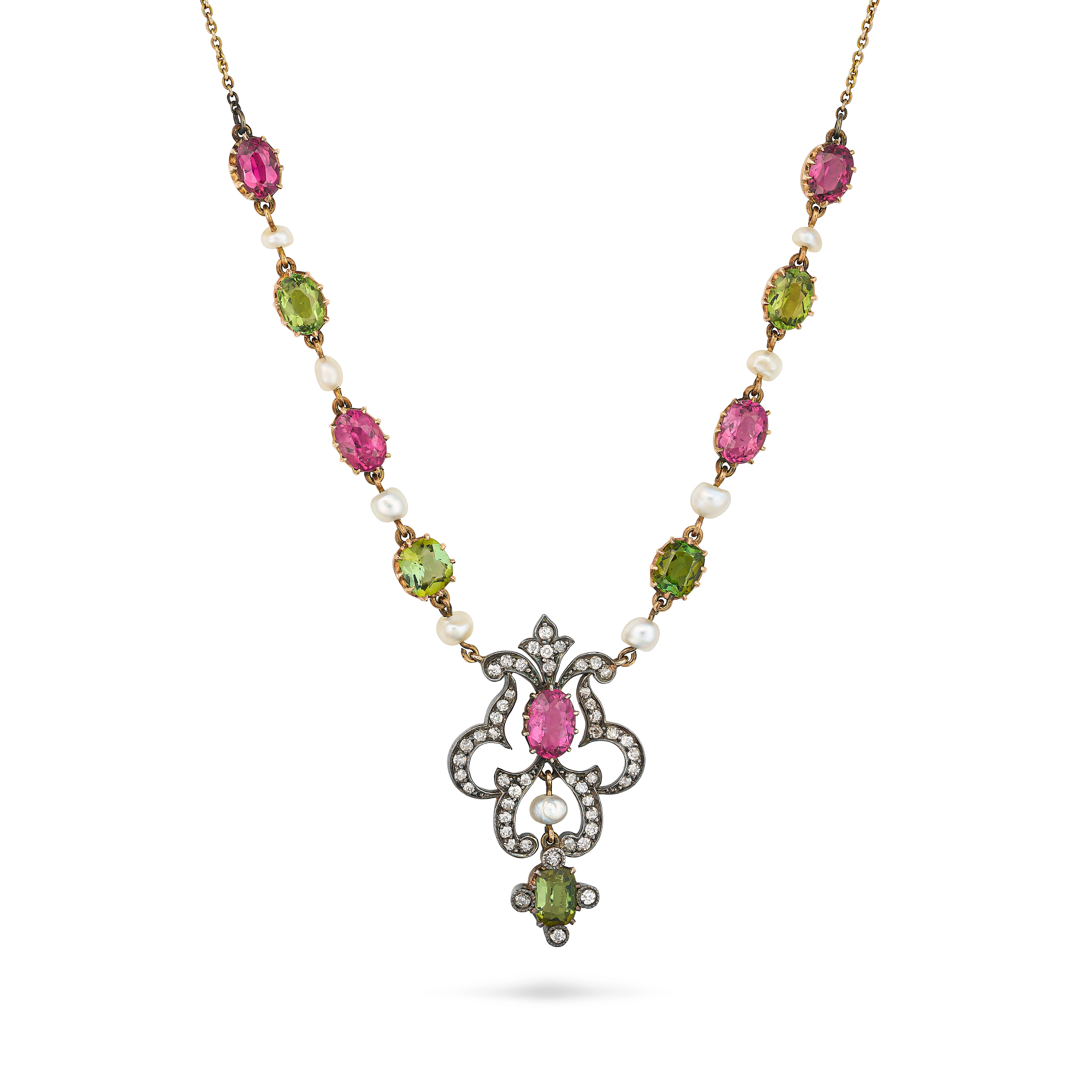 AN ANTIQUE PINK TOURMALINE, PERIDOT, PEARL AND DIA ...