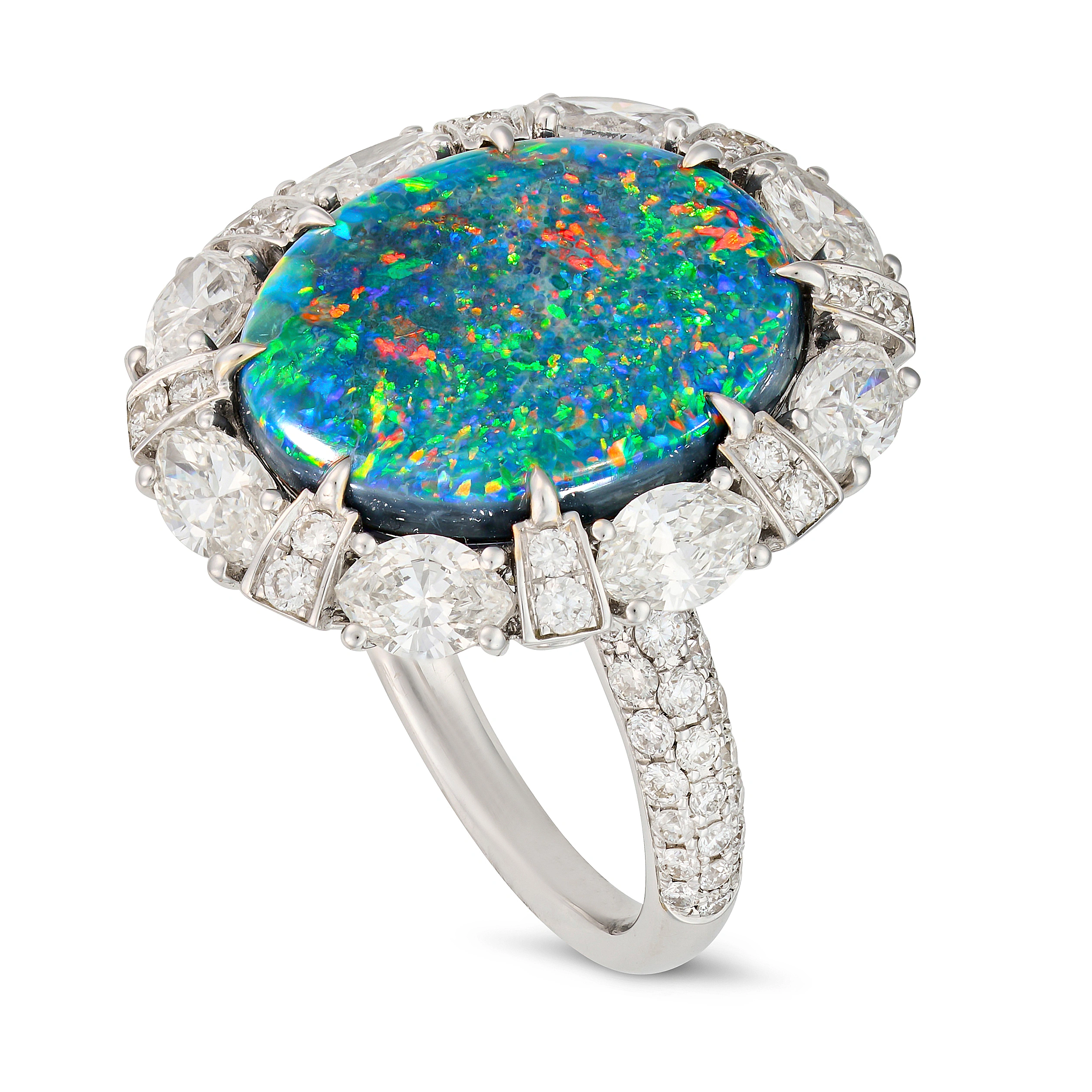 The present ring is centred on a superb oval cabochon black opal weighing 7.93 carats. Displaying a vibrant mosaic of electric blues, bright greens and flashes of orange-red across a dark body tone, the stone exhibits a bold and lively play-of-colour highly prized among collectors of fine opal. Stones of this size and quality are increasingly difficult to obtain, particularly when accompanied by confirmation that the gem shows no indications of colour treatment.
